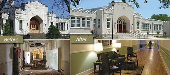 The scope of the project entailed completely gutting the existing 13 classroom schoolhouse building and leaving only the outside shell/façade of the building. New trusses and a new roof were installed as well as new interior wood framing. Each of the 13 classrooms remained as close as possible to the original-sized classrooms and were transformed into 13 new one-bedroom/one bath units. The high ceilings and over-sized windows remained the original size in each of the units and the original building’s curved walls and high ceilings provided exceptional architectural detail. The crown jewel of the building is the grand entrance and original auditorium; these were left intact as much as possible and are now the focal point of the building.
